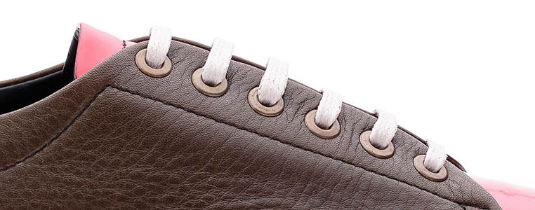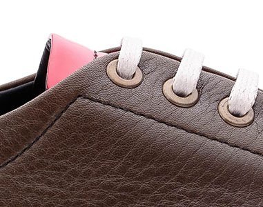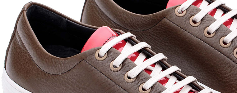 Congo é um par de sapatilhas produzido totalmente em pele, que combina a parte da frente e a pala em verniz vermelho e as restantes partes em verde Kaki. O clássico do século XXI com um toque de irreverência.