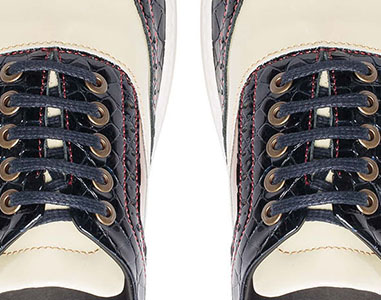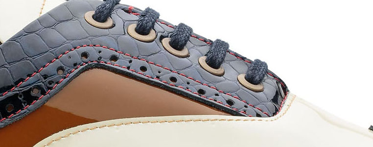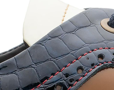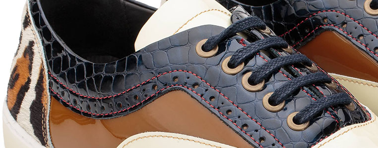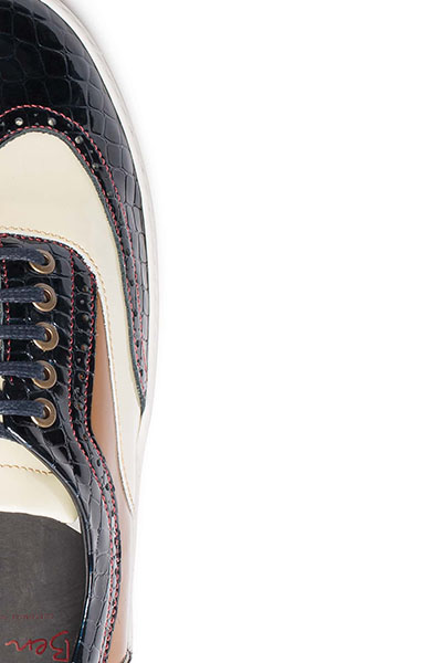 Darwin é uma sapatilha modelo wingtip oxford produzido totalmente em pele genuína, combinando 3 cores e 2 texturas. A textura em verniz croco azul contrasta com o verniz branco e moka e com as costuras em vermelho. A parte de trás em padrão chita marca a sua unicidade. Uma sapatilha ousada, elegante e que não passará despercebida.