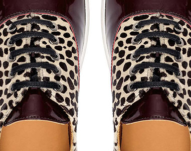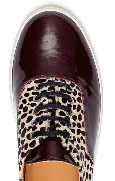 The Piano has been drinking é o modelo saddle sneakers produzido em pele genuína. Resulta da combinação de verniz bordô, verniz preto e pêlo com padrão leopardo preto e branco.Uma sapatilha com charme e elegância que se adapta a diferentes outfits, streetstyle, smart casual. Dá asas à tua imaginação e cria tendências.